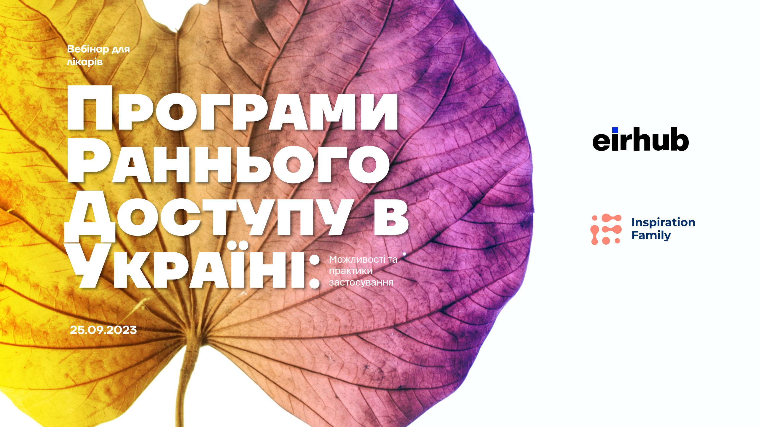 Консалтингова компанія Ейрхаб (https://eirhub.eu/uk/category.html) та фонд підтримки дорослих онкопацієнтів Inspiration Family (https://inspirationfamily.org) організували та провели 25 вересня 2023 року перший закритий вебінар для лікарів на тему "Програми раннього доступу в Україні: можливості та практики застосування".